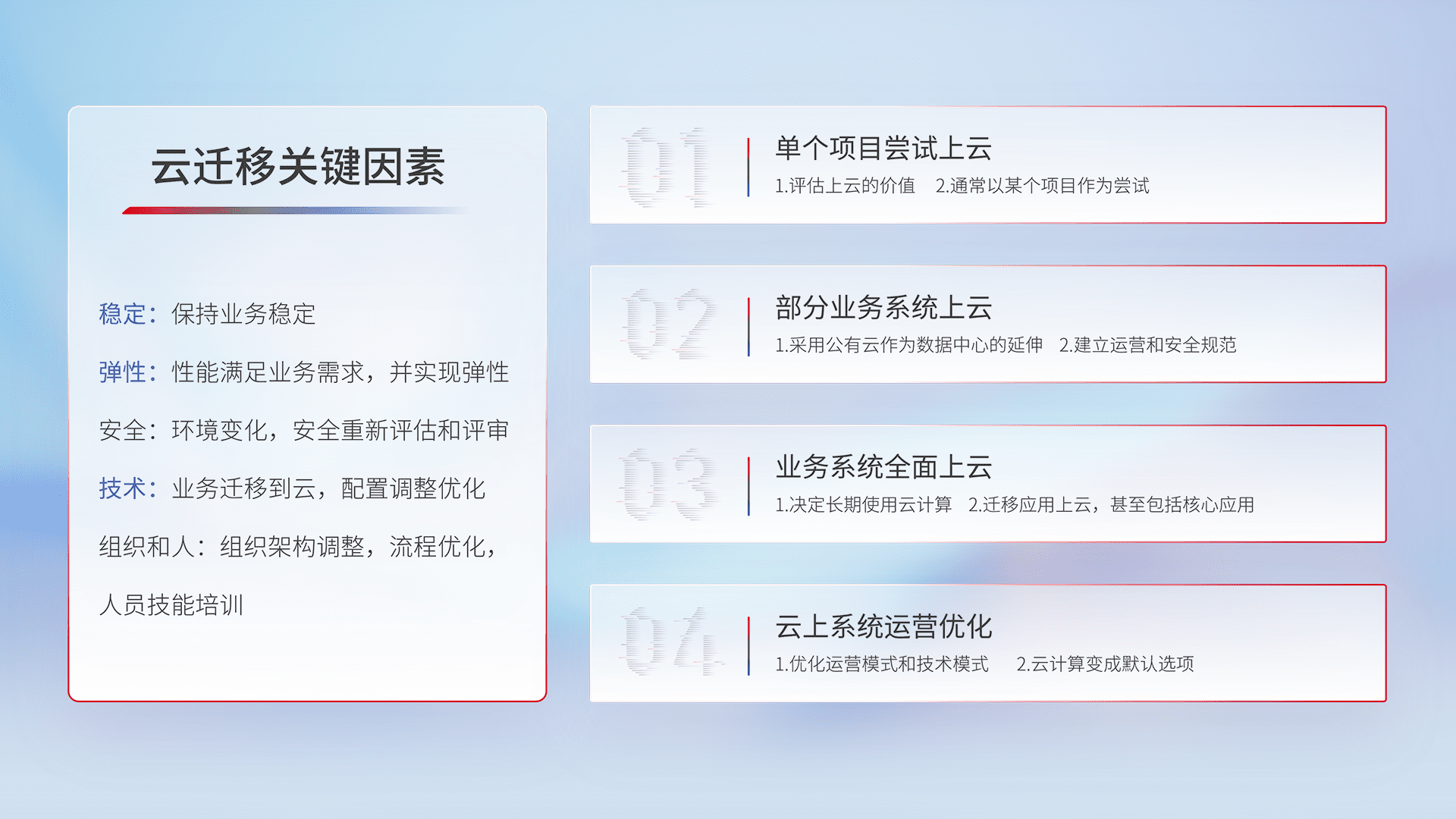 结合实际业务,,,从规划设计、、、云平台选型、、、、云原生改造、、数据迁移、、、集成交付,,,迁移全过程为客户识别最佳上云路径,,,,做好风险识别管理,,设计网络架构、、身份权限、、、安全审计合规、、操作审计、、、、日志审计、、、监控告警策略、、、多站点容灾设计等,,,对云上基础设施进行整体规划,,,,提升IT治理水平,,,,以满足弹性、、、、高可用、、、高性能的需求。。