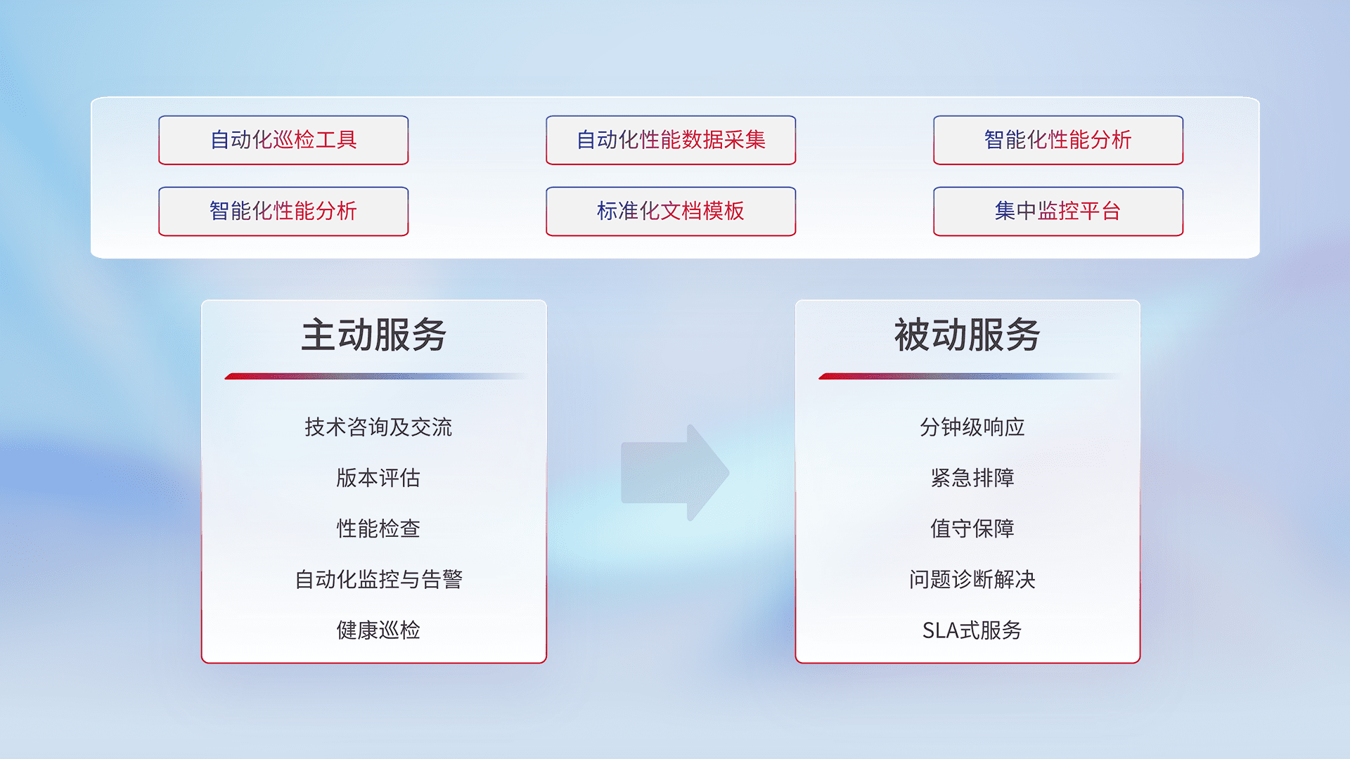 智能化工具和标准化文档,,,,保障服务质量,,,,提供主动服务(包含技术咨询、、、、版本评估、、、、性能检查、、、、自动化监控与告警、、、健康巡检)和被动服务包含(分钟级响应、、、、紧急排障、、值守保障、、、、问题诊断解决、、SLA服务)。。。