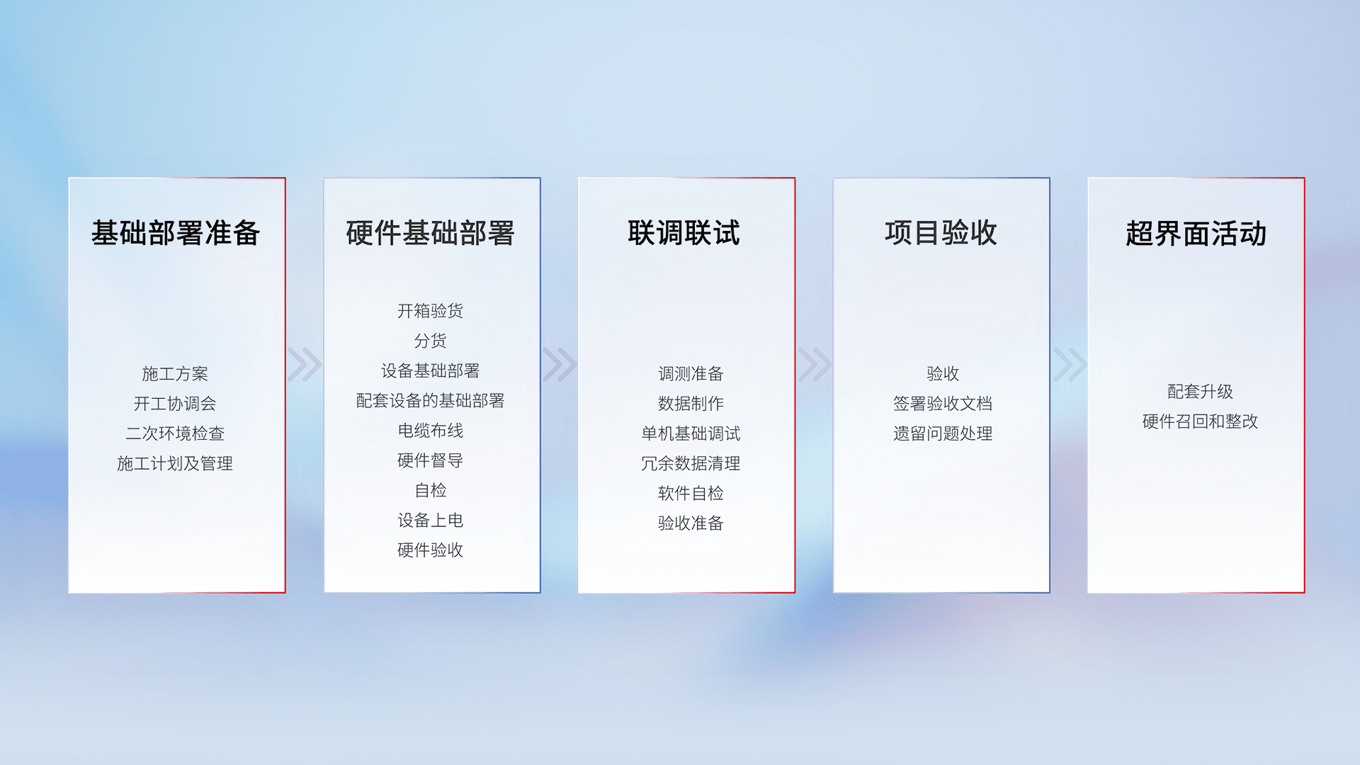 从基础部署准备、、硬件基础部署、、、、联调联试、、项目验收、、、越界面活动的全过程可追溯,,保证施工质量和进度。。。。